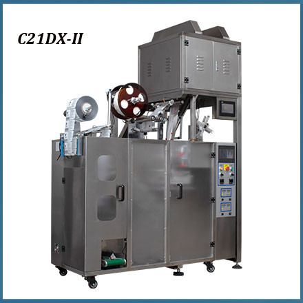 C21DX-II Triangle tea bag sealing and packing machinery is suitable for inner pyramid bag with outer envelope, and for packing multi-material product such as loose leaf tea, herbal tea, health care tea, TieGuanYin, Longjing, DaMaoFeng, DaHongPao, Rose tea, Ginseng, etc.
